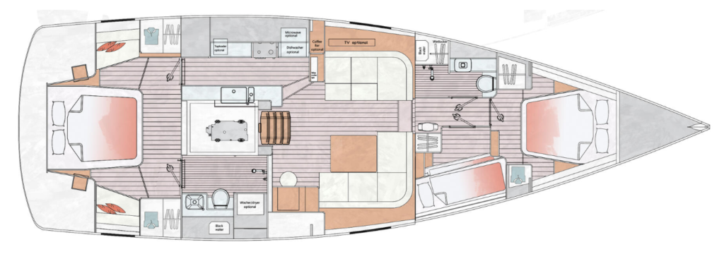 İç mekan: 50CS, Contest’in önceki tasarımları gibi alışılmış bir kamara düzenine sahip. Yeni tasarımın getirdiği değişikliklerle, kıç kabininin hem daha geniş hem de daha geride konumlanması, daha büyük bir salon ve merkezi yerleştirilmiş bir kuzine /galley için alan sağlıyor. Baş ve kıç kamaralar geniş ve konforlu yataklar ve cömertçe gün ışığı sağlayan geniş lombozlara sahip. 50CS’in içmekanındaki başka bir avantaj, teknenin baş-kıç doğrultusunda, çaparizsiz rahat hareket olanağı sağlayan düz orta koridor. Opsiyonel üçüncü kabin ranzaları mürettebat kabini veya ofis / çalışma odası olarak donatılabilir.